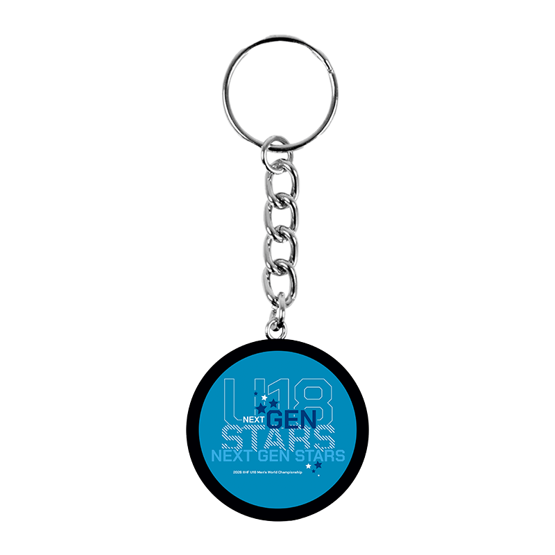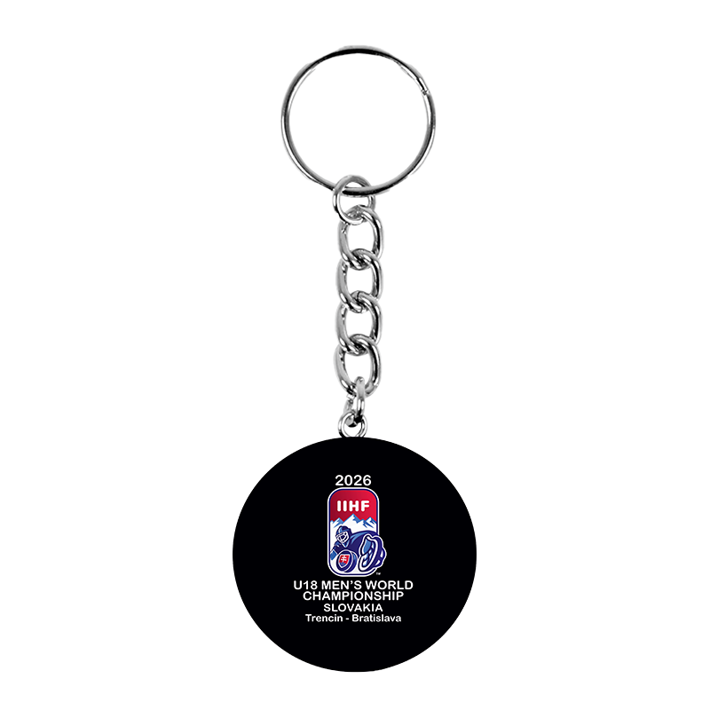 Prívesok na kľúče s dizajnom k šampionátu 2026 IIHF Majstrovstvá sveta hráčov do 18 rokov.