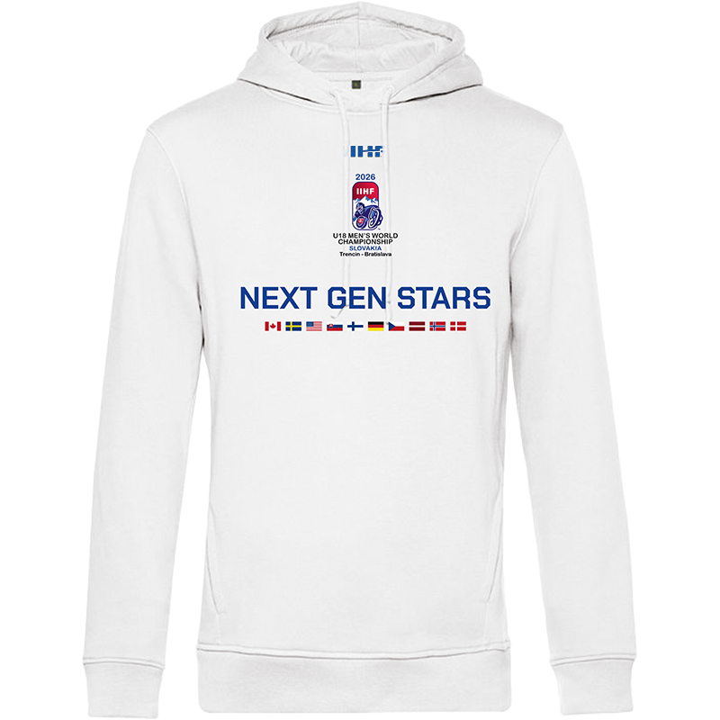 Fanúšikovská mikina s kapucňou s dizajnom k šampionátu 2026 IIHF Majstrovstvá sveta hráčov do 18 rokov.